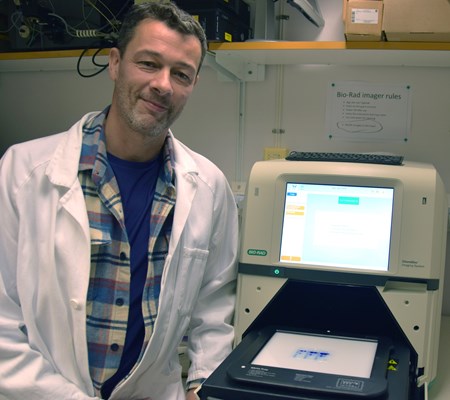 Mer kunskap med ny teknik Ett anslag om 400 000 kronor från Lundbergs Forskningsstiftelse har finansierat ny laboratorieutrustning i form av ett så kallat gel-dokumentationssystem. Det gör det möjligt för Herwig Schüler och hans team att, med hjälp av fluorescens, för första gången faktiskt se de kemiska flaggorna i cellerna. ”Om en flagga finns på ett protein så får vi en ljussignal som visar det.